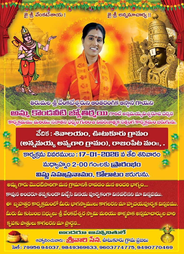 Spread the loveకడప జిల్లా జనవరి 30 (నవ్యంధ్ర న్యూస్ ) అన్నమయ్య జిల్లా రాజంపేట ప్రఖండ, దేవరకొండ భానుమూర్తి శర్మ స్వామి ఆధ్వర్యంలో పదకవితాపితామహులుశ్రీ తాళ్ళపాకఅన్నమాచార్యుల వారి 108 అడుగుల విగ్రహం వద్ద వెలసియున్నశ్రీ వెంకటేశ్వర్ల స్వామి ఆలయంలో శుక్రవారం సామజిక సమరసత సంఘ సభ్యులు చేపట్టినపాదయాత్ర జిల్లా కార్యదర్శి.శ్రీయతిరాజుజయసింహ ప్రసాద్శ్రీ వెంకటేశ్వర స్వామిని…